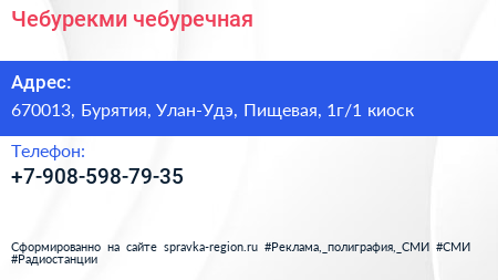 Чебурекми, чебуречная по адресу 670013, Бурятия, Улан-Удэ, Пищевая, 1г/1 киоск в дальнейшем Организация, размещена в следующих категориях: