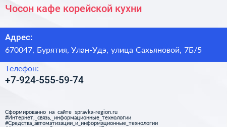 Чосон, кафе корейской кухни по адресу 670047, Бурятия, Улан-Удэ, улица Сахьяновой, 7Б/5 в дальнейшем Организация, размещена в следующих категориях:
