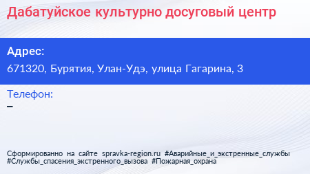 Дабатуйское, культурно-досуговый центр по адресу 671320, Бурятия, Улан-Удэ, улица Гагарина, 3 в дальнейшем Организация, размещена в следующих категориях: