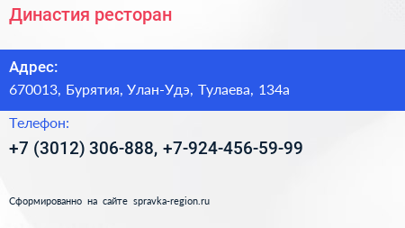 Династия, ресторан по адресу 670013, Бурятия, Улан-Удэ, Тулаева, 134а в дальнейшем Организация, размещена в следующих категориях: