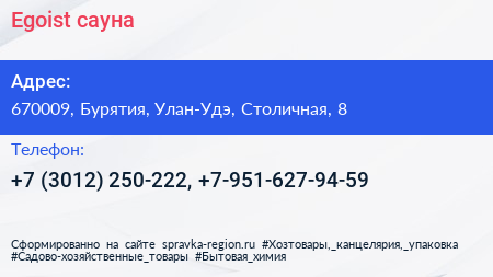 Egoist, сауна по адресу 670009, Бурятия, Улан-Удэ, Столичная, 8 в дальнейшем Организация, размещена в следующих категориях: