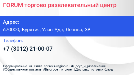 FORUM, торгово-развлекательный центр по адресу 670000, Бурятия, Улан-Удэ, Ленина, 39 в дальнейшем Организация, размещена в следующих категориях: