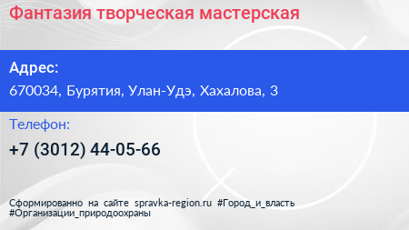 Фантазия, творческая мастерская по адресу 670034, Бурятия, Улан-Удэ, Хахалова, 3 в дальнейшем Организация, размещена в следующих категориях: