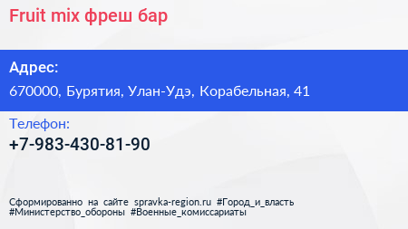 Fruit mix, фреш-бар по адресу 670000, Бурятия, Улан-Удэ, Корабельная, 41 в дальнейшем Организация, размещена в следующих категориях:
