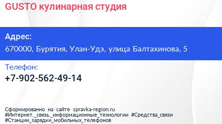 GUSTO, кулинарная студия по адресу 670000, Бурятия, Улан-Удэ, улица Балтахинова, 5 в дальнейшем Организация, размещена в следующих категориях: