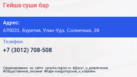 Гейша, суши-бар по адресу 670031, Бурятия, Улан-Удэ, Солнечная, 28 в дальнейшем Организация, размещена в следующих категориях: