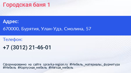 Городская баня №1 по адресу 670000, Бурятия, Улан-Удэ, Смолина, 57 в дальнейшем Организация, размещена в следующих категориях: