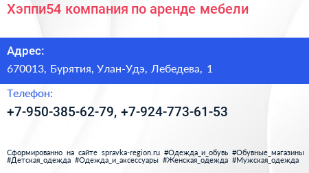 Хэппи54, компания по аренде мебели по адресу 670013, Бурятия, Улан-Удэ, Лебедева, 1 в дальнейшем Организация, размещена в следующих категориях: