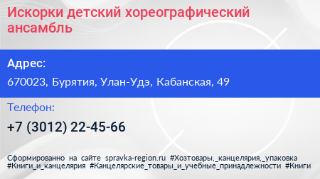 Искорки, детский хореографический ансамбль по адресу 670023, Бурятия, Улан-Удэ, Кабанская, 49 в дальнейшем Организация, размещена в следующих категориях:
