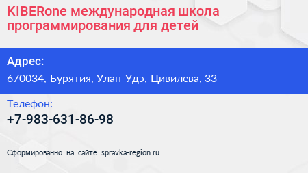 KIBERone, международная школа программирования для детей по адресу 670034, Бурятия, Улан-Удэ, Цивилева, 33 в дальнейшем Организация, размещена в следующих категориях: