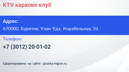 KTV, караоке-клуб по адресу 670000, Бурятия, Улан-Удэ, Корабельная, 33 в дальнейшем Организация, размещена в следующих категориях: