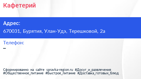 Кафетерий по адресу 670031, Бурятия, Улан-Удэ, Терешковой, 2а в дальнейшем Организация, размещена в следующих категориях: