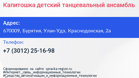 Капитошка, детский танцевальный ансамбль по адресу 670009, Бурятия, Улан-Удэ, Краснодонская, 2а в дальнейшем Организация, размещена в следующих категориях:
