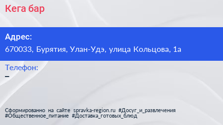 Кега, бар по адресу 670033, Бурятия, Улан-Удэ, улица Кольцова, 1а в дальнейшем Организация, размещена в следующих категориях: