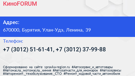 КиноFORUM по адресу 670000, Бурятия, Улан-Удэ, Ленина, 39 в дальнейшем Организация, размещена в следующих категориях: