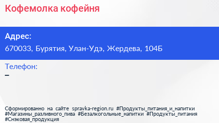Кофемолка, кофейня по адресу 670033, Бурятия, Улан-Удэ, Жердева, 104Б в дальнейшем Организация, размещена в следующих категориях: