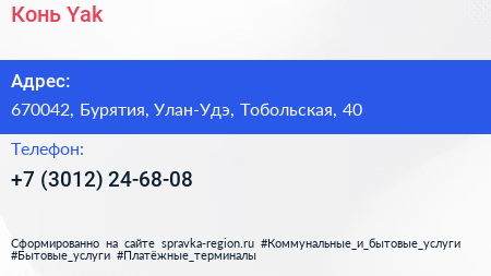 Конь & Yak по адресу 670042, Бурятия, Улан-Удэ, Тобольская, 40 в дальнейшем Организация, размещена в следующих категориях:
