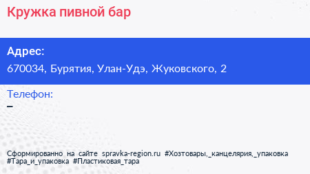 Кружка, пивной бар по адресу 670034, Бурятия, Улан-Удэ, Жуковского, 2 в дальнейшем Организация, размещена в следующих категориях: