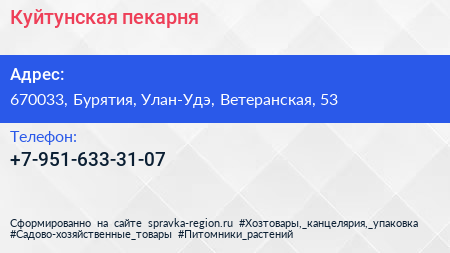 Куйтунская пекарня по адресу 670033, Бурятия, Улан-Удэ, Ветеранская, 53 в дальнейшем Организация, размещена в следующих категориях: