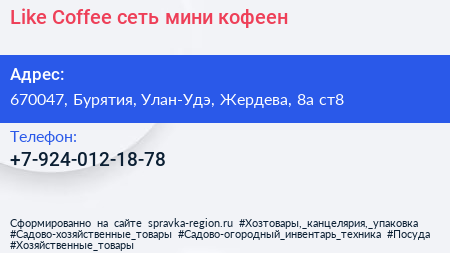 Like Coffee, сеть мини-кофеен по адресу 670047, Бурятия, Улан-Удэ, Жердева, 8а ст8 в дальнейшем Организация, размещена в следующих категориях: