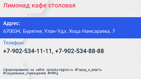 Лимонад, кафе-столовая по адресу 670034, Бурятия, Улан-Удэ, Хоца Намсараева, 7 в дальнейшем Организация, размещена в следующих категориях: