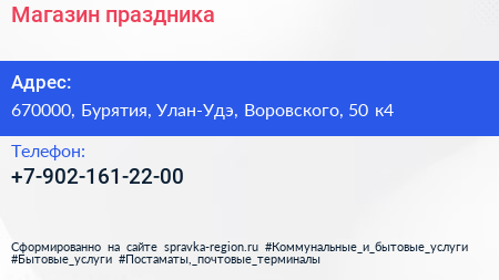 Магазин праздника по адресу 670000, Бурятия, Улан-Удэ, Воровского, 50 к4 в дальнейшем Организация, размещена в следующих категориях: