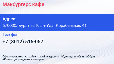 Макбургерс, кафе по адресу 670000, Бурятия, Улан-Удэ, Корабельная, 41 в дальнейшем Организация, размещена в следующих категориях: