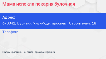 Мама испекла, пекарня-булочная по адресу 670042, Бурятия, Улан-Удэ, проспект Строителей, 18 в дальнейшем Организация, размещена в следующих категориях: