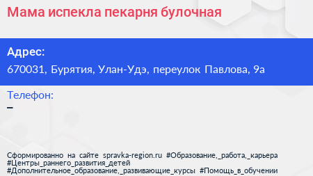 Мама испекла, пекарня-булочная по адресу 670031, Бурятия, Улан-Удэ, переулок Павлова, 9а в дальнейшем Организация, размещена в следующих категориях: