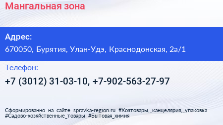 Мангальная зона по адресу 670050, Бурятия, Улан-Удэ, Краснодонская, 2а/1 в дальнейшем Организация, размещена в следующих категориях: