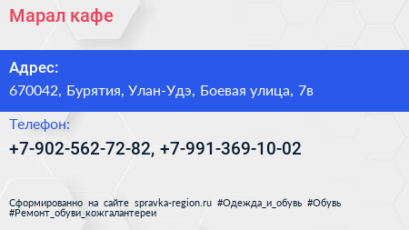 Марал, кафе по адресу 670042, Бурятия, Улан-Удэ, Боевая улица, 7в в дальнейшем Организация, размещена в следующих категориях: