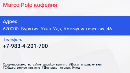 Marco Polo, кофейня по адресу 670000, Бурятия, Улан-Удэ, Коммунистическая, 46 в дальнейшем Организация, размещена в следующих категориях: