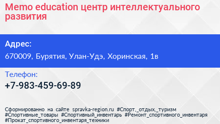 Memo education, центр интеллектуального развития по адресу 670009, Бурятия, Улан-Удэ, Хоринская, 1в в дальнейшем Организация, размещена в следующих категориях: