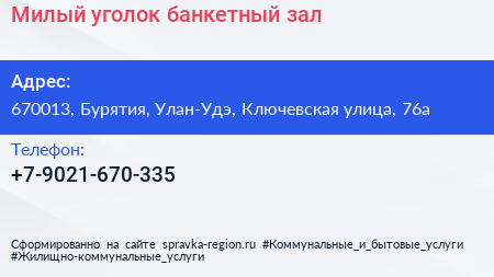 Милый уголок, банкетный зал по адресу 670013, Бурятия, Улан-Удэ, Ключевская улица, 76а в дальнейшем Организация, размещена в следующих категориях: