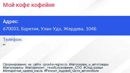 Мой кофе, кофейня по адресу 670033, Бурятия, Улан-Удэ, Жердева, 104Б в дальнейшем Организация, размещена в следующих категориях: