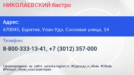 НИКОЛАЕВСКИЙ, бистро по адресу 670045, Бурятия, Улан-Удэ, Сосновая улица, 14 в дальнейшем Организация, размещена в следующих категориях: