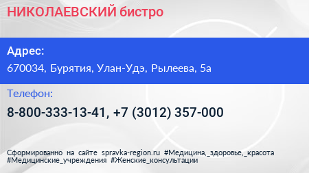 НИКОЛАЕВСКИЙ, бистро по адресу 670034, Бурятия, Улан-Удэ, Рылеева, 5а в дальнейшем Организация, размещена в следующих категориях: