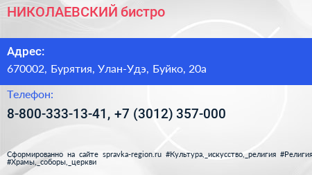 НИКОЛАЕВСКИЙ, бистро по адресу 670002, Бурятия, Улан-Удэ, Буйко, 20а в дальнейшем Организация, размещена в следующих категориях: