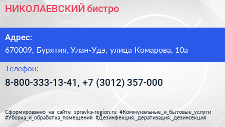 НИКОЛАЕВСКИЙ, бистро по адресу 670009, Бурятия, Улан-Удэ, улица Комарова, 10а в дальнейшем Организация, размещена в следующих категориях: