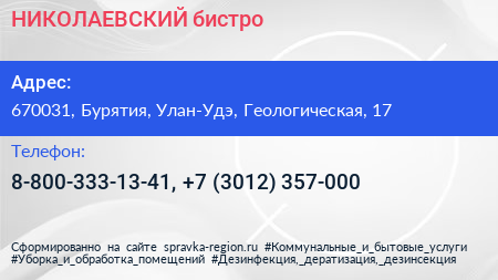 НИКОЛАЕВСКИЙ, бистро по адресу 670031, Бурятия, Улан-Удэ, Геологическая, 17 в дальнейшем Организация, размещена в следующих категориях:
