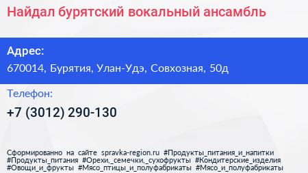 Найдал, бурятский вокальный ансамбль по адресу 670014, Бурятия, Улан-Удэ, Совхозная, 50д в дальнейшем Организация, размещена в следующих категориях: