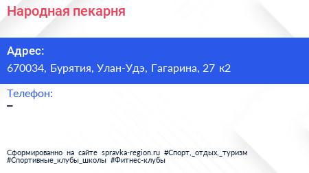 Народная, пекарня по адресу 670034, Бурятия, Улан-Удэ, Гагарина, 27 к2 в дальнейшем Организация, размещена в следующих категориях: