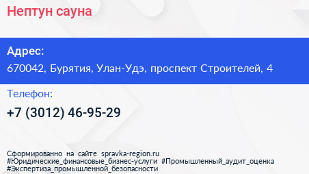 Нептун, сауна по адресу 670042, Бурятия, Улан-Удэ, проспект Строителей, 4 в дальнейшем Организация, размещена в следующих категориях: