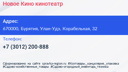 Новое Кино, кинотеатр по адресу 670000, Бурятия, Улан-Удэ, Корабельная, 32 в дальнейшем Организация, размещена в следующих категориях: