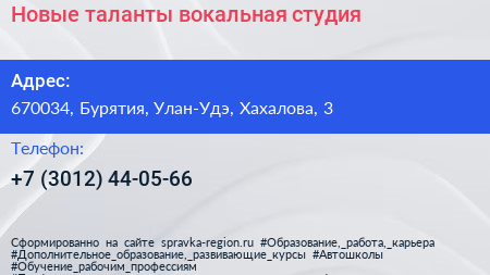 Новые таланты, вокальная студия по адресу 670034, Бурятия, Улан-Удэ, Хахалова, 3 в дальнейшем Организация, размещена в следующих категориях: