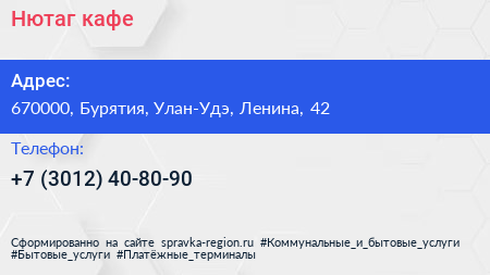 Нютаг, кафе по адресу 670000, Бурятия, Улан-Удэ, Ленина, 42 в дальнейшем Организация, размещена в следующих категориях: