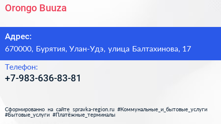 Orongo Buuza по адресу 670000, Бурятия, Улан-Удэ, улица Балтахинова, 17 в дальнейшем Организация, размещена в следующих категориях: