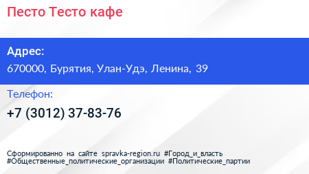Песто Тесто, кафе по адресу 670000, Бурятия, Улан-Удэ, Ленина, 39 в дальнейшем Организация, размещена в следующих категориях: