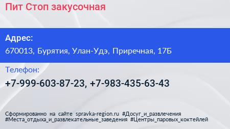 Пит Стоп, закусочная по адресу 670013, Бурятия, Улан-Удэ, Приречная, 17Б в дальнейшем Организация, размещена в следующих категориях: