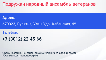 Подружки, народный ансамбль ветеранов по адресу 670023, Бурятия, Улан-Удэ, Кабанская, 49 в дальнейшем Организация, размещена в следующих категориях: